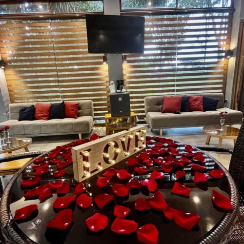 Especial: incluye 45 velas en el jazuzzi, 36 globos, el tipi en el área del césped sintético frente al rio decorado con luces, detalle con pétalos en el jacuzzi y camino, detalle con toallas, letras tomando en cuenta la temática (feliz cumpleaños, amor, aniversario).