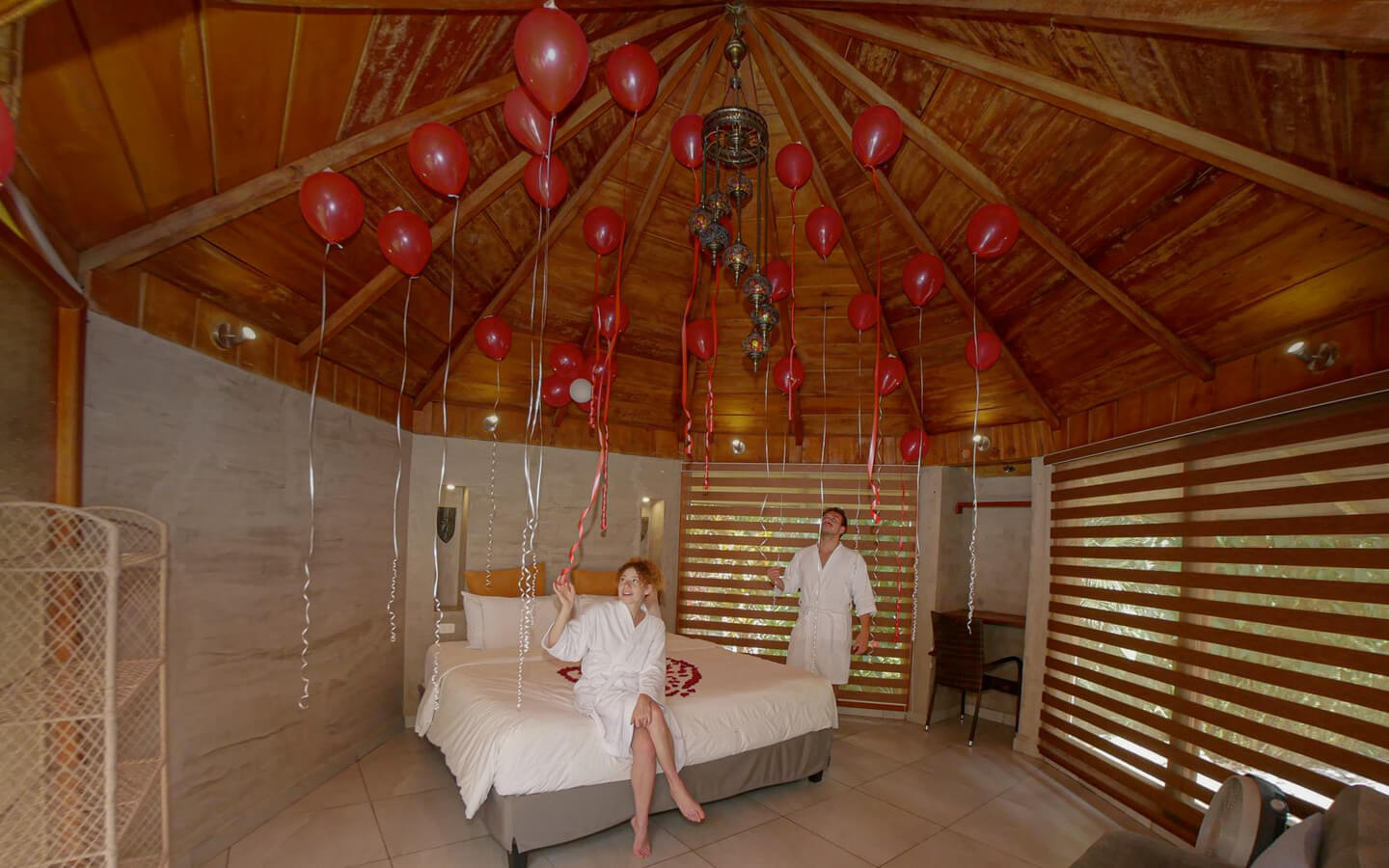 Especial: incluye 18 velas, 24 globos, sorpresa con chocolate, camino con pétalos, detalle con toallas, letras tomando en cuenta la temática (feliz cumpleaños, amor, aniversario).